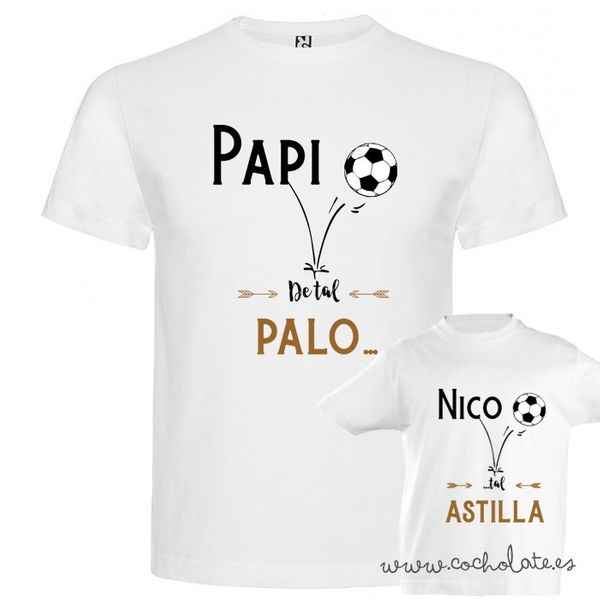 La camiseta del adulto va decorada con el texto “Papi”, un dibujo de la afición y el diseño “de tal palo”. Por otro lado, la camiseta del niñ@ va personalizada con su nombre el dibujo de la afición compartida y el diseño “tal astilla”.