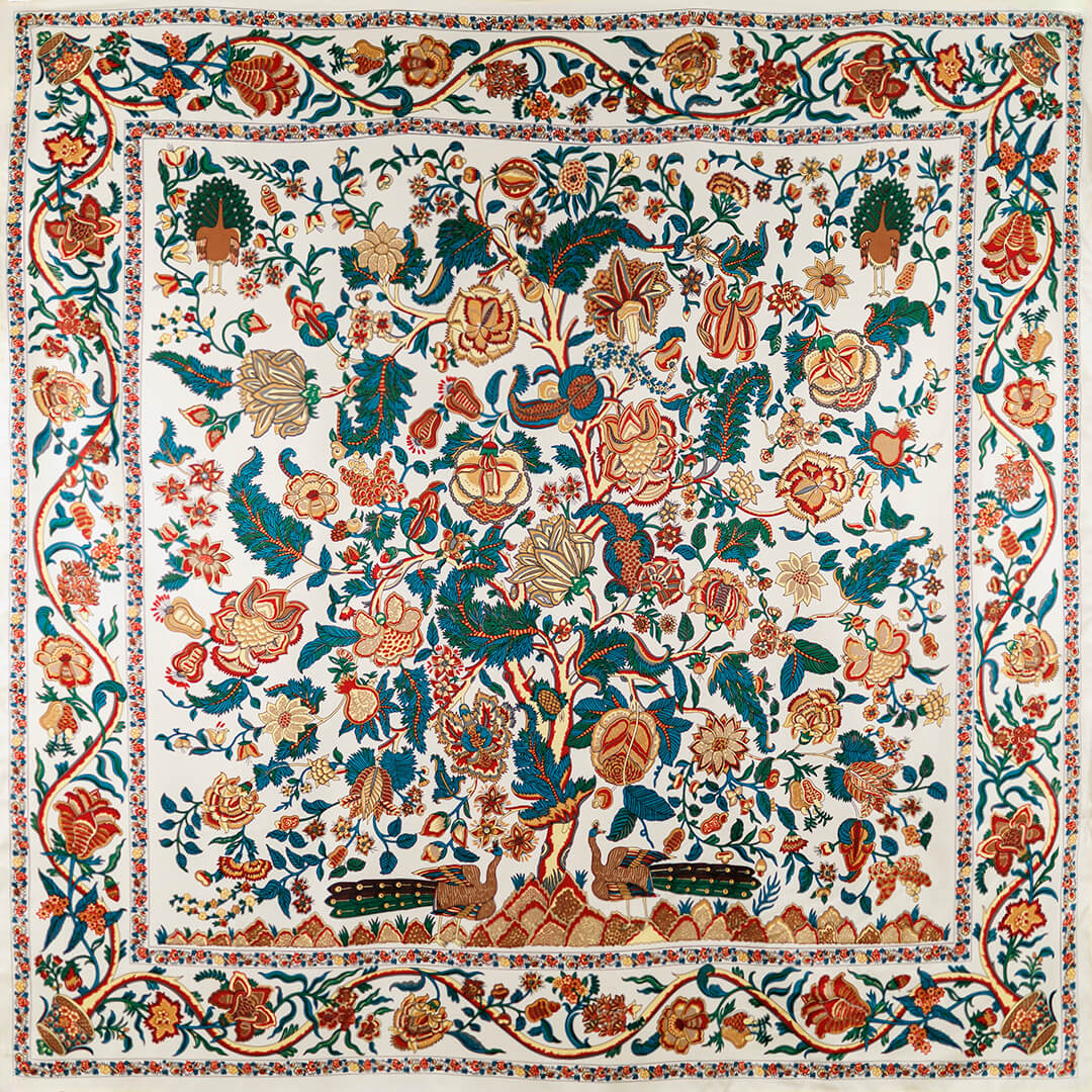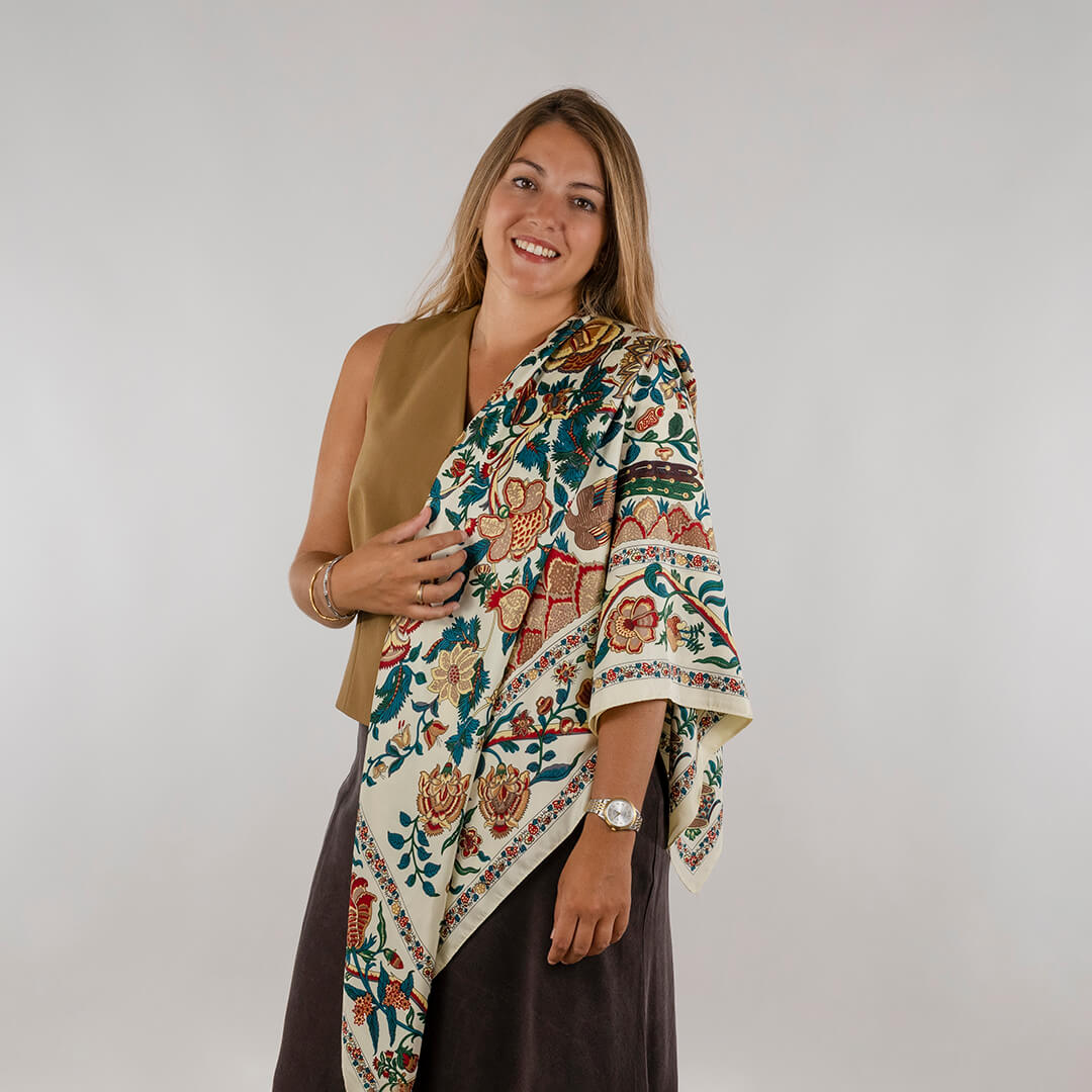 Este pañuelo es puro encanto retro. Su print de flores y pavos reales está lleno de detalles que lo convierten en una pieza muy especial. Los colores, cálidos y vibrantes a la vez, están pensados para que encajen con absolutamente todo tu armario: desde un look relajado de diario con jeans y camiseta blanca, hasta un conjunto más elegante para una cena o evento especial.